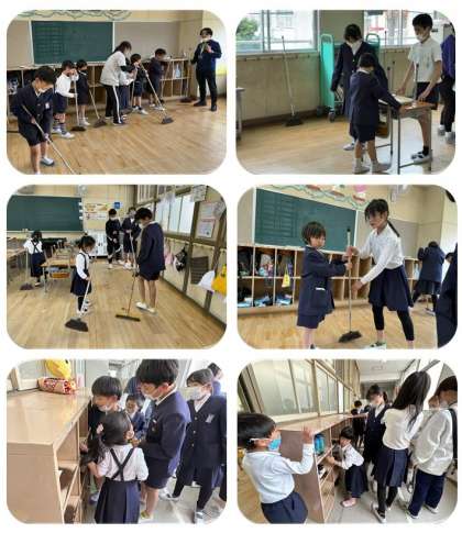 そうじの時間に、九条東小学校のリーダー6年生が、1年生にそうじの仕方を教えに来てくれました。ほうきの持ち方やはき方、つくえの運び方、くつばこのふき方など優しくていねいに教えてくれました。6年生のおかげで、1年生がそうじの仕方を覚えることができました。