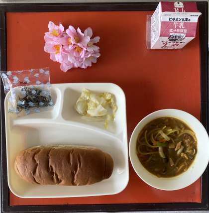 今日の献立は、カレースープスパゲッティ、キャベツのピクルス、ミニフィッシュ、黒糖パン、牛乳でした。
