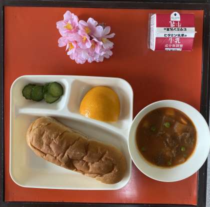 今日の献立は、ビーフシチュー、きゅうりのサラダ、あまなつかん、黒糖パン、牛乳でした。