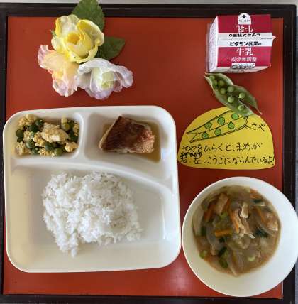 今日の給食の献立は、あかうおのしょうゆだれかけ、みそ汁、えんどうの卵とじ、ごはん、牛乳でした。
