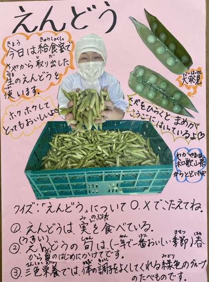 今日は、給食室で一粒ずつさやから実を取り出しました。作業は大変ですが、生のえんどうで作る「えんどうの卵とじ」は子どもたちに人気の献立で、ぜひ旬を感じてほしい一品です。