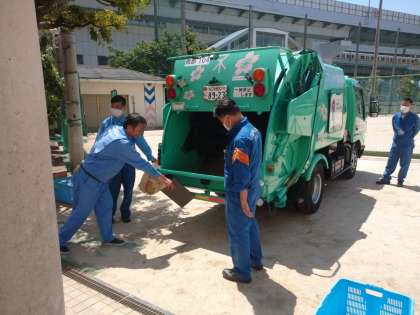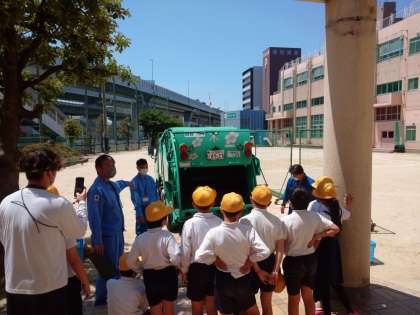 今日は、環境事業局の方が来られて、ゴミや環境について学習しました。パッカー車の見学もしました。