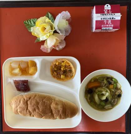 今日の給食の献立は、豚肉と野菜のカレースープ煮、五目汁、変わりピザ、ミックスフルーツ(缶)、コッペパン、いちごジャム、牛乳でした。