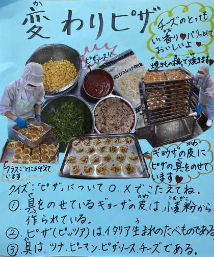 ピザの具は、ツナ、コーン、ピーマン、ピザソース、チーズを混ぜ合わせた具をのせ、焼き物機で焼いています。子どもたちに人気の献立です。