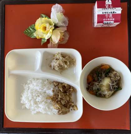 今日の給食の献立は、肉じゃが、もやしのゆずの香あえ、ごまかかいため、ごはん、牛乳でした。