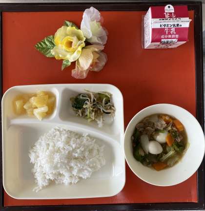 今日の給食の献立は、八宝菜、チンゲンサイともやしのしょうがあえ、パインアップル(カット缶)ごはん、牛乳でした。