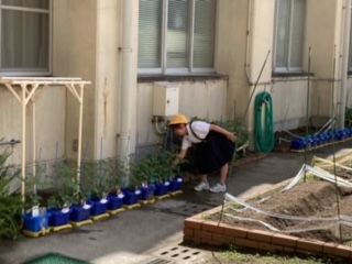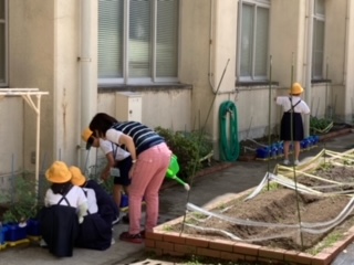 休み時間、ミニトマトに、しっかり水をあげました。