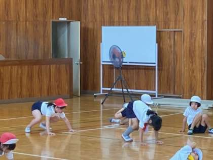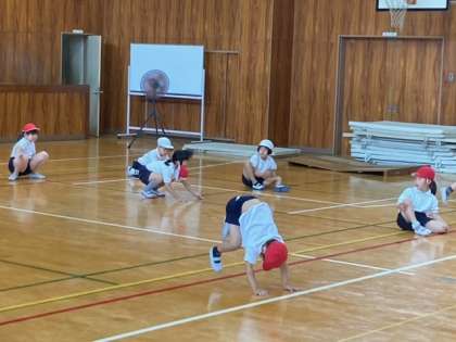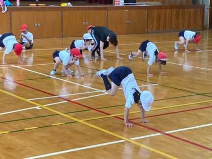 体育の時間の様子です。カエルの足打ちに挑戦しました。