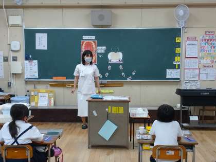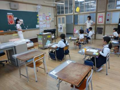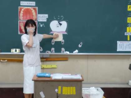 歯科衛生士さんが来られて、虫歯や歯みがきの学習をしました。熱心に聞いています。