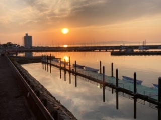 海洋センターの玄関から見える夕日。