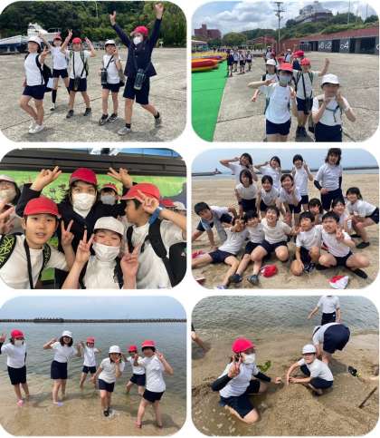 次は、浜遊びです。貝殻を拾ったり、砂を掘って道を作ったり、思い思いに楽しんでいました。浜遊びが終わると、カヌー体験です。二人一組で乗り込み、パドルを息を合わせて漕いで、海の上を進んでいきます。最初は苦戦していたペアも時間がたつにつれ、パドルの扱いに慣れ、気持ちよさそうに海の上を進んでいました。