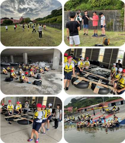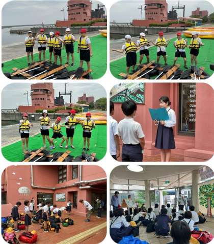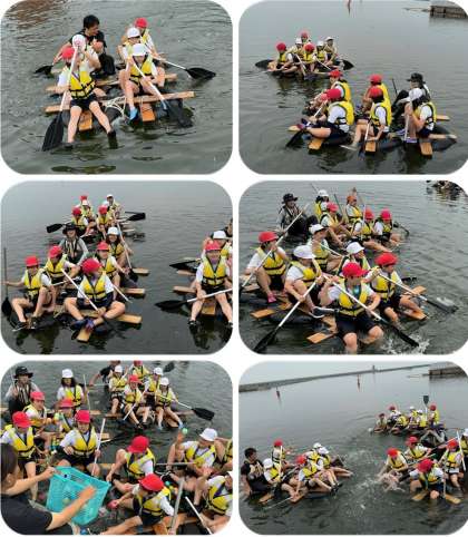 朝ご飯を食べた後は、いかだ体験です。六人一組でいかだに乗って、気持ちを合わせパドルを漕ぎます。昨日のカヌー体験より人数が増え、息を合わせるのも、より大変そうでした。いかだが進むようになってきたところで、ボール拾い競争などを行い、盛り上がっていました。