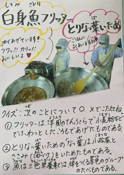 今日の給食の献立は、白身魚のフリッター、すまし汁、とりなっ葉いため、ごはん、牛乳でした。