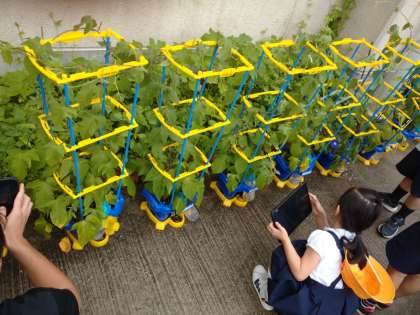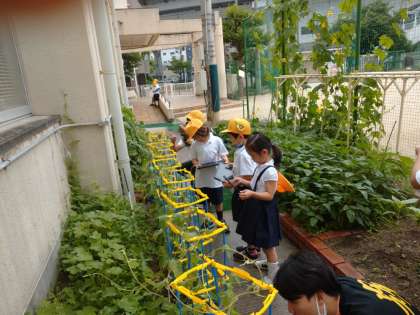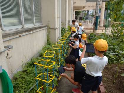 あさがおの観察をしています。つるが伸びてよく育っています。