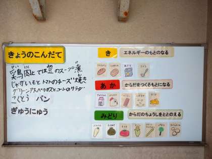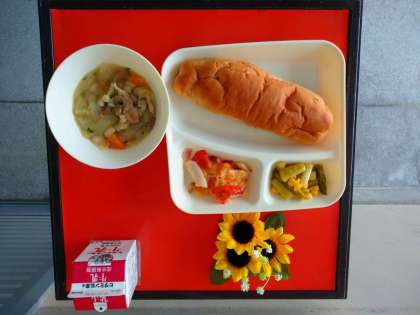 今日の給食は、鶏肉とてぼ豆のスープ煮、じゃがいもとトマトのチーズ焼き、グリーンアスパラガスとコーンのサラダ、パン、牛乳です。