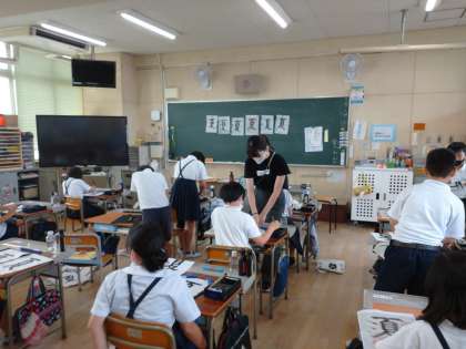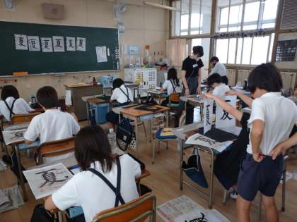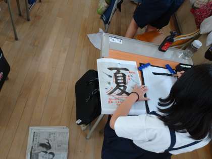 習字で、夏という字を書きました。手本を見て丁寧に書いています。
