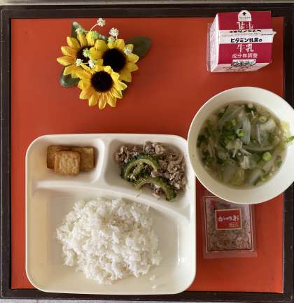 今日の給食の献立は、ゴーヤチャンプルー、五目汁、あつあげのしょうがじょうゆかけ、ごはん、牛乳でした。