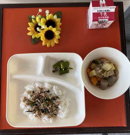 今日の給食の献立は、豚肉とじゃがいもの煮もの、オクラの梅風味、ツナっ葉いため、ごはん、牛乳でした。