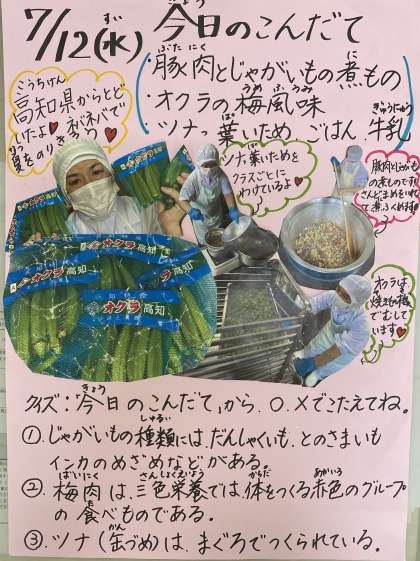 今日は朝からとても暑く、豚肉のビタミンB1、じゃがいものビタミンC、オクラのカロテンや食物繊維など夏の暑さに負けない栄養たっぷりの給食でした。😊