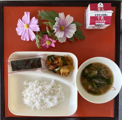 今日の給食の献立は、酢豚、中華みそスープ、焼きのり、ごはん、牛乳でした。