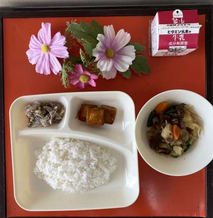 今日の給食の献立は、肉じゃが、あつあげのみそだれかけ、キャベツの赤じそあえ、ごはん、牛乳でした。