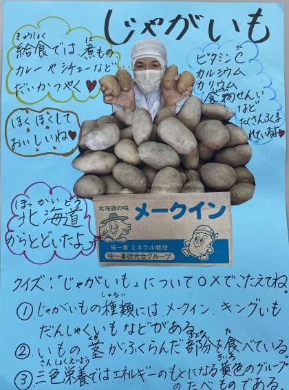今日の給食の「肉じゃが」に使われているメークインは、煮くずれしにくいので、煮物や、カレー、シチューによく使われます。男爵いもはほくほくしているので、コロッケやポテトサラダなどにぴったしです。