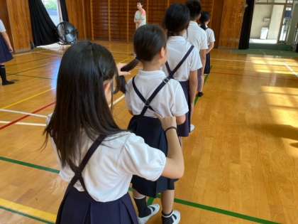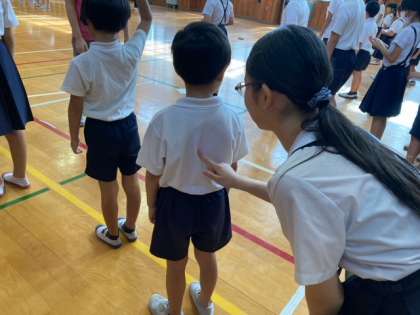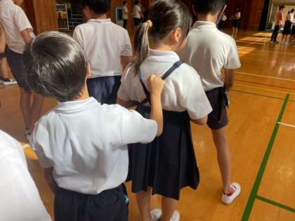 今日の集会は、「伝言ゲーム」でした。3文字の平仮名を背中に書いて、伝言したのですが、なかなか難しかったようで、正解した班は一班だけでした。