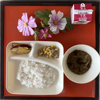 今日の給食の献立は、マーボーなす、ツナと野菜のいためもの、焼きさつまいもの甘みつかけ、ごはん、牛乳でした。