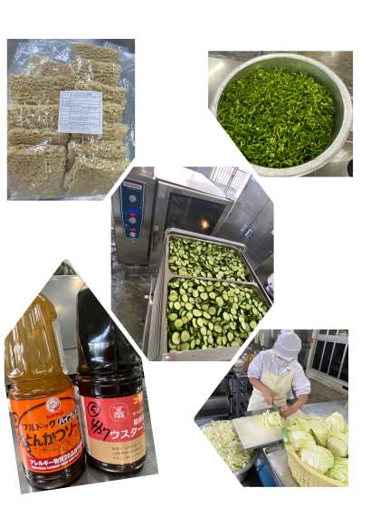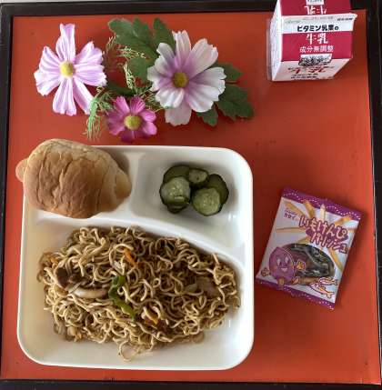 今日の給食の献立は、焼きそば、きゅうりのしょうがづけ、いもけんぴフィッシュ、 1/2黒糖パン、牛乳でした。