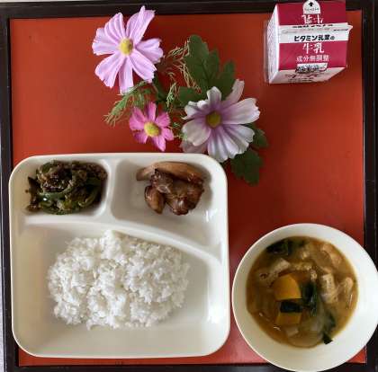 今日の給食の献立は、鶏肉のてり焼き、かぼちゃのみそ汁、なすのそぼろいため、ごはん、牛乳でした。