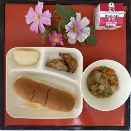 今日の給食の献立は、あげぎょうざ、鶏肉ととうがんの中華煮、なし(二十世紀)、コッペパン、マーマレード、牛乳でした。
