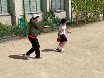 理科「とじこめた空気や水」の学習の後は、空気鉄砲の教材を使って遊びました。