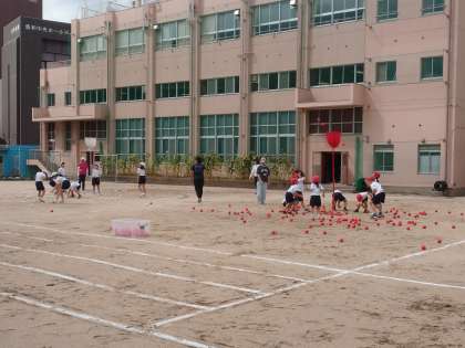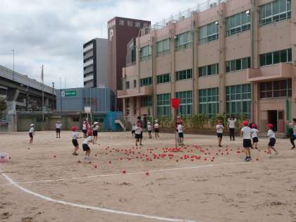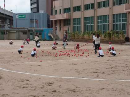 玉入れを練習しました。みんな一生懸命に玉入れをしています。