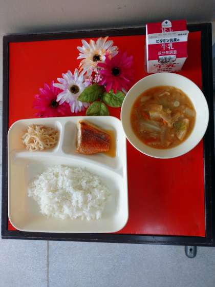 今日の献立は、あかうおのしょうゆだれかけ、豚汁、もやしのゆずの香あえ、ごはん、牛乳です。