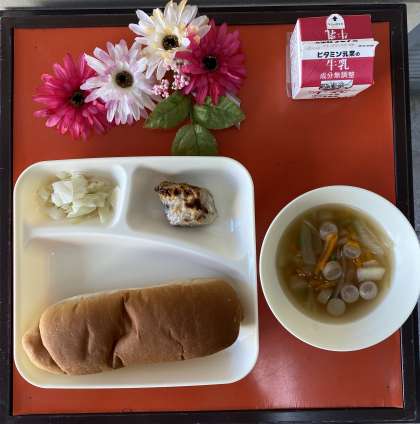 今日の給食の献立は、かつおガーリックマリネ焼き、ウインナーとじゃがいものスープ、キャベツのサラダ、黒糖パン、牛乳でした。