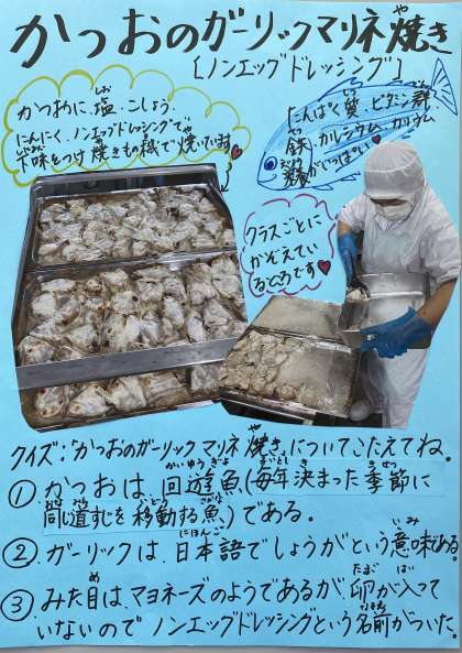 ノンエッグドレッシングであえたかつおを焼き物機で焼きとても香ばしく食べやすいかつおガーリックマリネ焼きは子どもたちもしっかりと食べてくれていました。