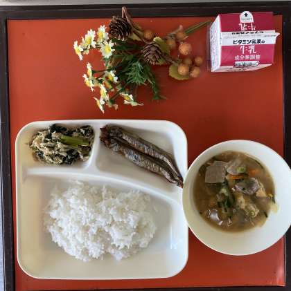 今日の給食の献立は、焼きししゃも、みそ汁、こまつなのいためもの、ごはん、牛乳でした。