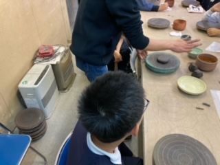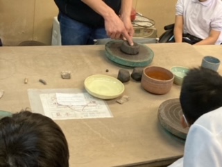焼き物(陶芸)体験が始まりました。まず、説明を聞きています。