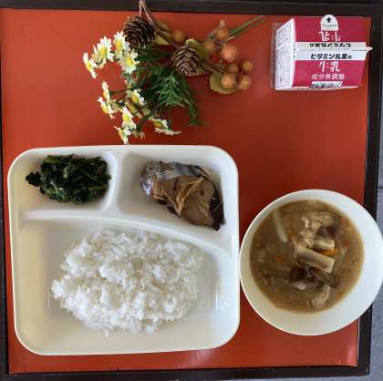 今日の給食の献立は、なまりぶしのしょうが煮、なめこのみそ汁、ほうれんそうのごまあえ、ごはん、牛乳でした。
