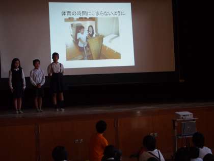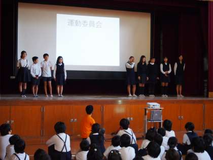 児童集会で運動委員会の発表がありました。運動場の使い方のルールについてポスターを作成・掲示したり、体育倉庫の片付けをしたりしていることや、もうすぐ一輪車が使えるようになるというお知らせがありました。