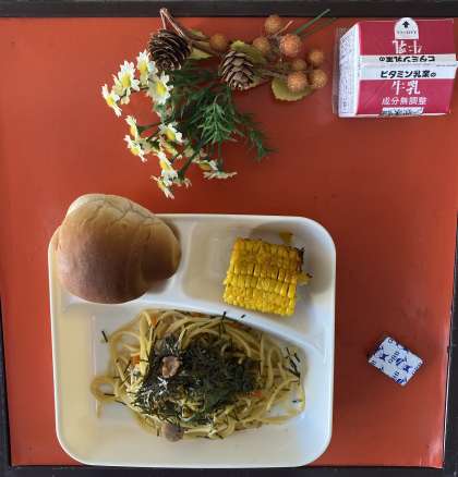 今日の給食の献立は、ウインナーときのこの和風スパゲッティ、焼きとうもろこし、固形チーズ、1/2黒糖パン、牛乳でした。