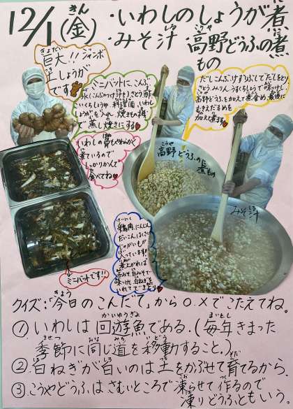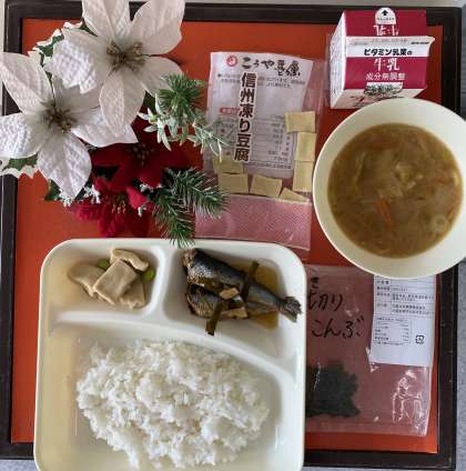 今日の給食の献立は、いわしのしょうが煮、みそ汁、高野どうふの煮もの、ごはん、牛乳でした。