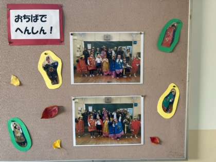 拾ってきた落ち葉で「おちばでへんしん!」に取り組みました。素敵な衣装が出来上がりました。