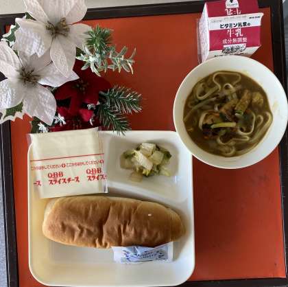 今日の給食の献立は、カレーうどん、はくさいのおひたし、スライスチーズ、コッペパン、ブルーベリージャム、牛乳でした。