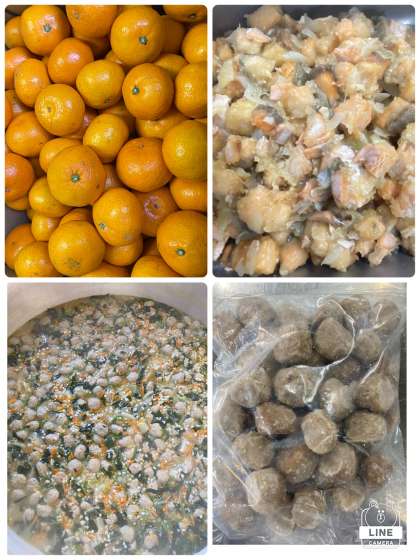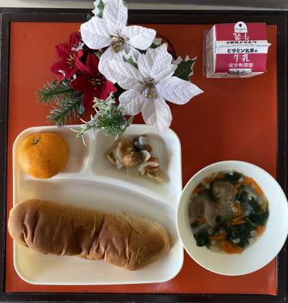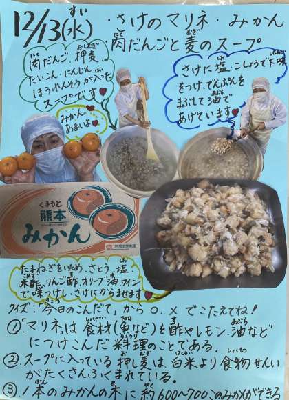 今日の給食の献立は、さけのマリネ、肉だんごと麦のスープ、みかん、黒糖パン、牛乳でした。