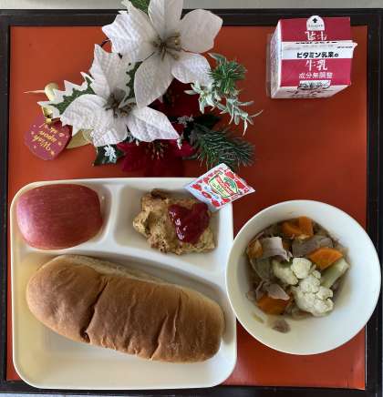 今日の給食の献立は、とうふローフ、カリフラワーのスープ煮、りんご、黒糖パン、牛乳でした。