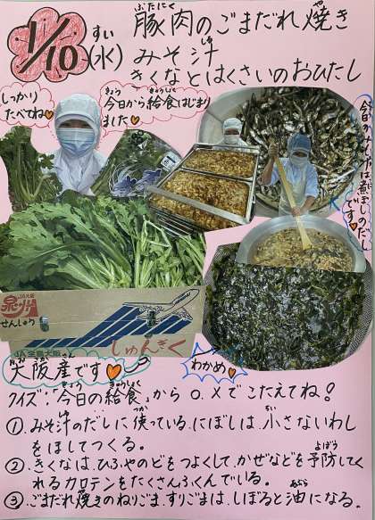 今日の給食の献立は、豚肉のごまだれ焼き、みそ汁、きくなとはくさいのおひたし、ごはん、牛乳でした。