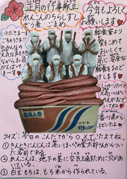 今日の給食の献立は、れんこんのちらしずし、ぞう煮、ごまめ、牛乳でした。