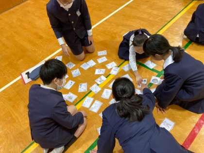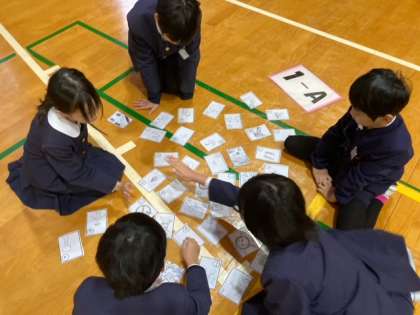今日の集会は、班ごとに「かるた 大会」を行いました。手作りのかるたが、とても良くできていました。