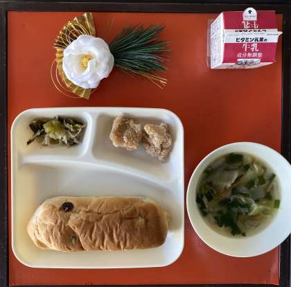 今日の給食の献立は、鶏肉のからあげ、中華スープ、チンゲンサイともやしの甘酢あえ、レーズンパン、牛乳でした。